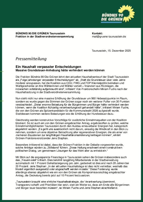 Pressemitteilung Fraktion Bündnis 90 / Die Grünen Taunusstein