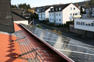 Wenn man man genau davor steht, unterscheidet sich das Haus Wilhelm-Jacoby-Straße 2 in Bleidenstadt nicht von seinen Nachbarhäusern. Man muss schon einige Schritte zurücktreten auf den gegenüberliegenden Bürgersteig. Dann erst kann man die 60 Solarpanels mit einer Gesamtfläche von 37 qm richtig sehen.