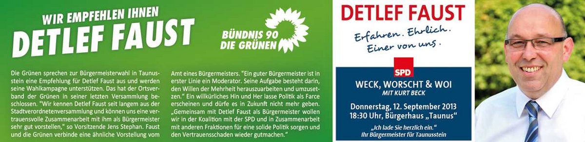 Faust und die Grünen verbinde eine ähnliche Vorstellung vom Amt eines Bürgermeisters. "Ein guter Bürgermeister ist in erster Linie ein Moderator. Seine Aufgabe besteht darin, den Willen der Mehrheit herauszuarbeiten und umzusetzen.“ Auch programmatisch lägen Grüne und Faust nahe beieinander. Der Kandidat der SPD habe in der eigenen Partei stets auf die Einhaltung der Koalitionsvereinbarungen gedrängt.